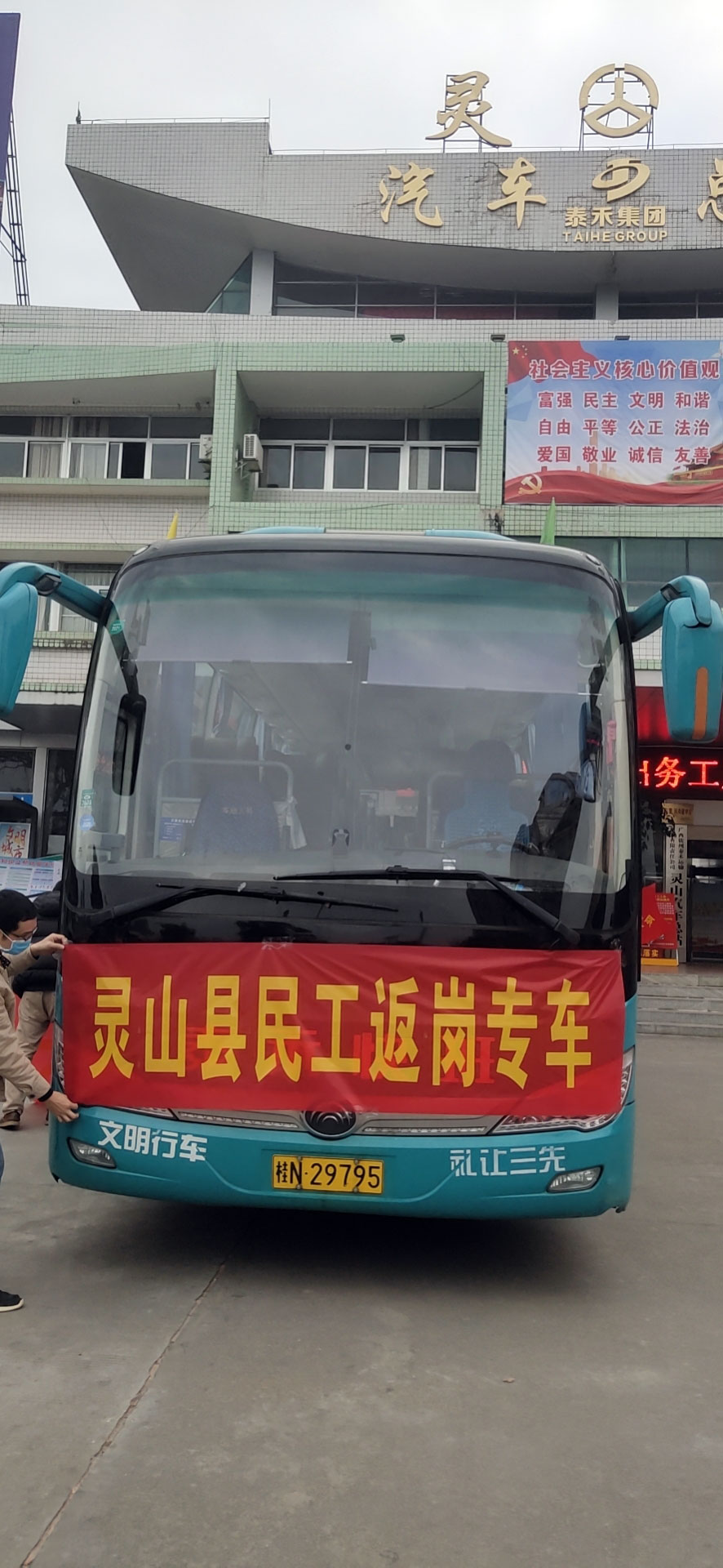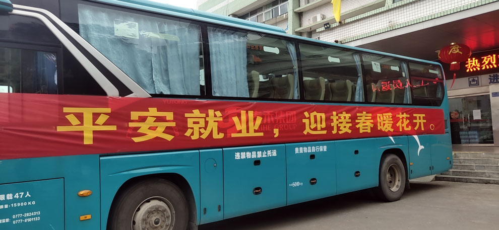 2月25日,為進一步解決人員到崗不足問題,除科室人員利用休息時間支援一線外,在總裁王咸車的統籌安排下,又組織人力資源部和分廠員工5人招聘小組前往廣西橫縣、靈山等人口大縣開專車接員工返回和現場招聘新員工工作。